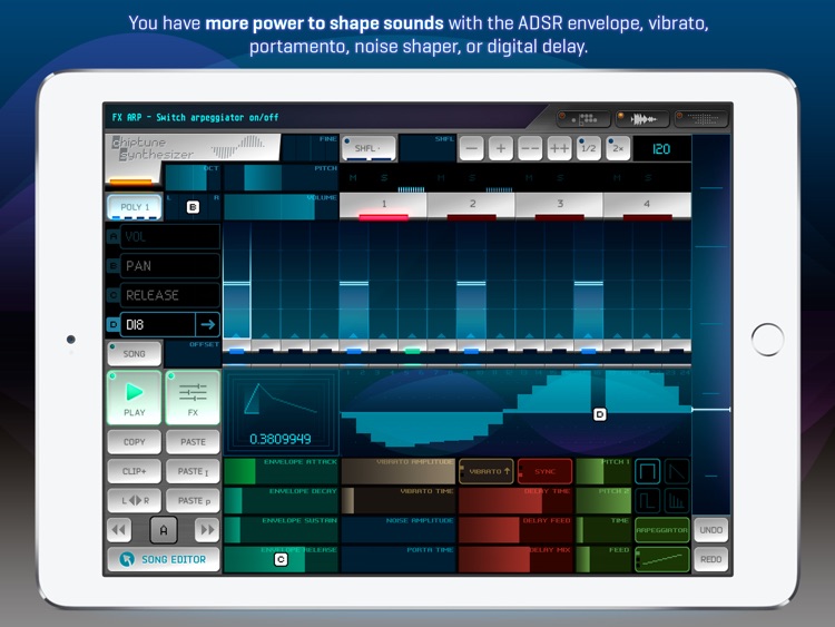 Every instrument is a wavetable synthesizer. With the advanced effect module, you have more power to shape sounds with the ADSR envelope, vibrato, portamento, noise shaper, or digital delay. Drawable waveform synth module allows users to draw and modify their own wave and use it as a sample oscillator – with that you can use Rytmik as a sonically unique chiptune synthesizer.